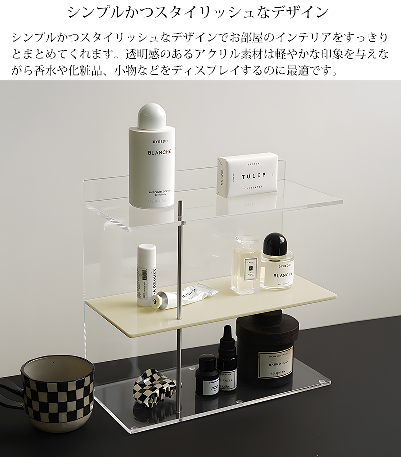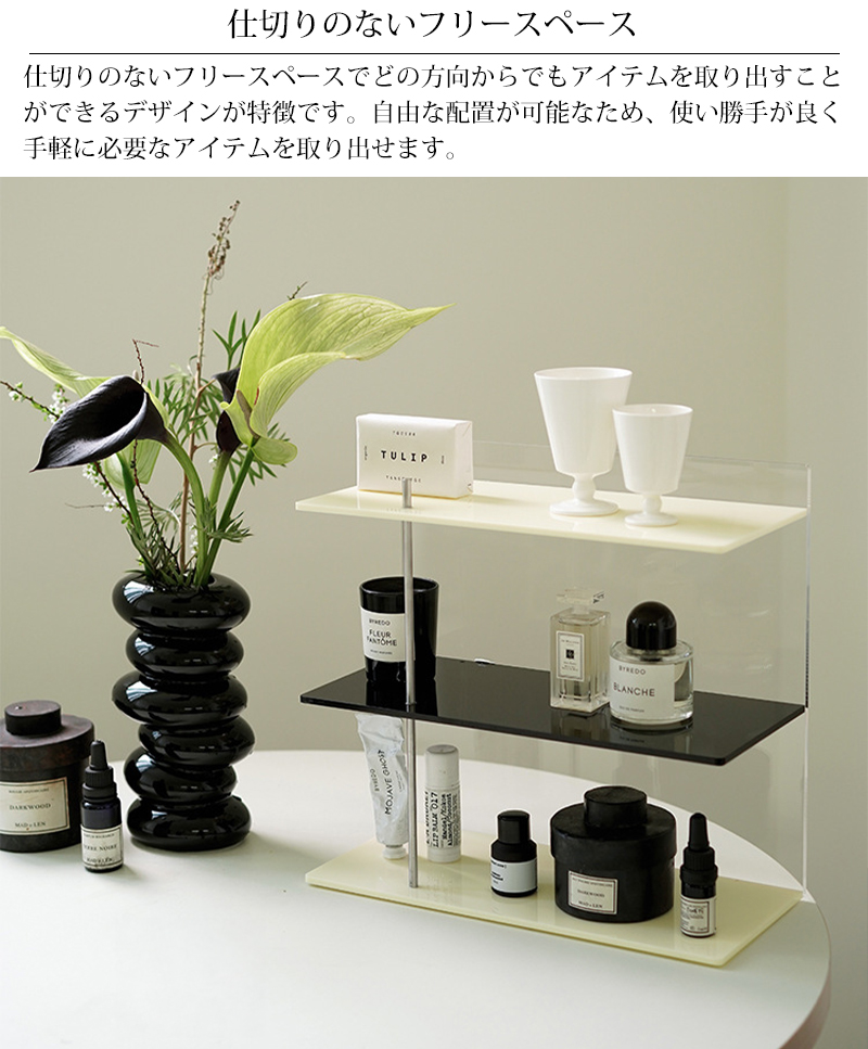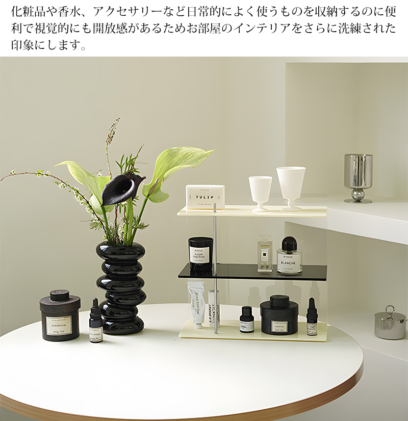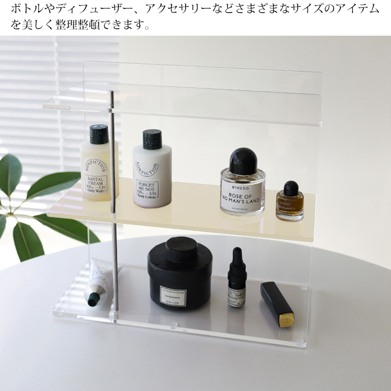 透明感のあるアクリル素材は軽やかな印象を与えながら香水や化粧品、小物などをディスプレイするのに最適です。