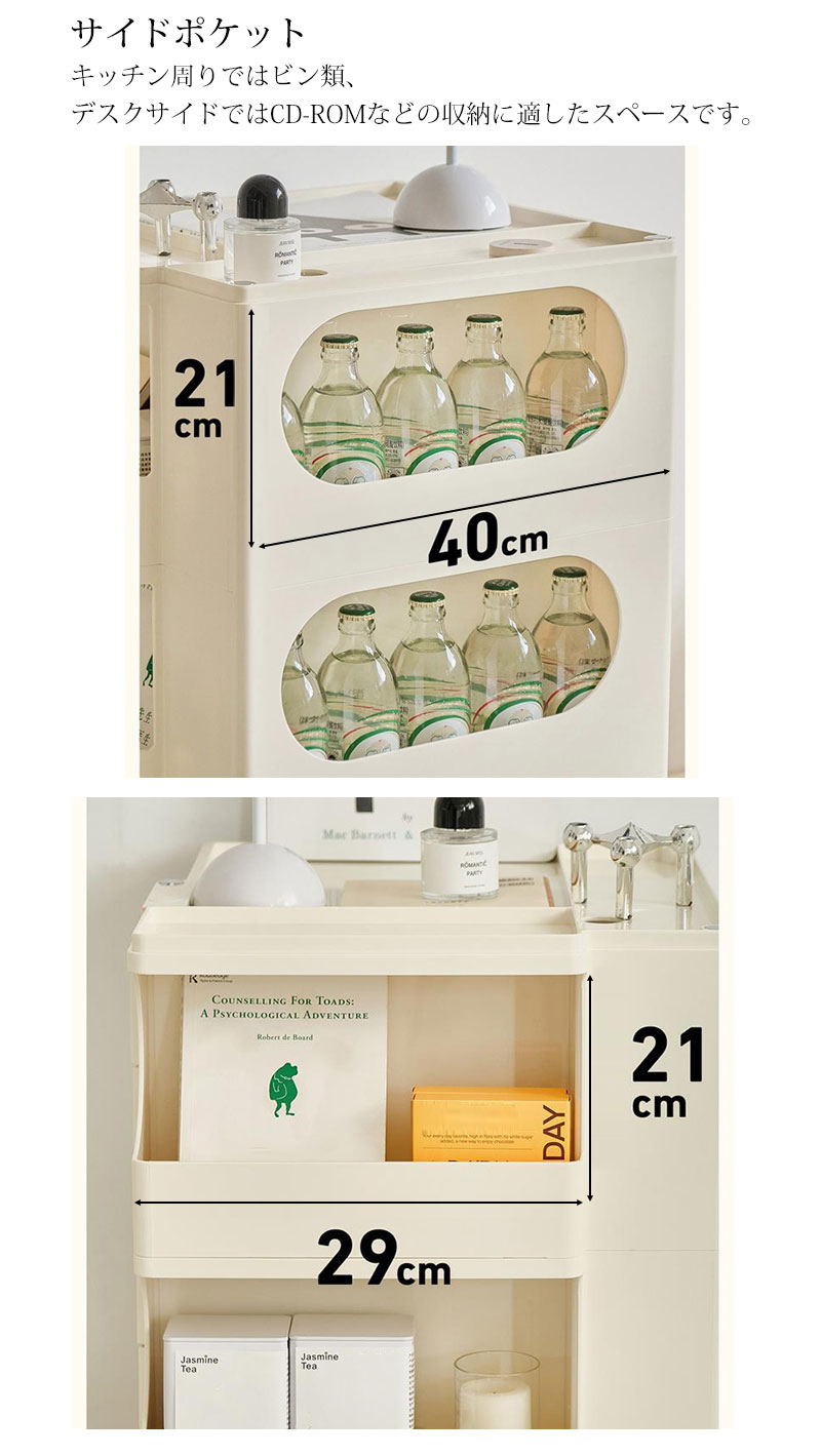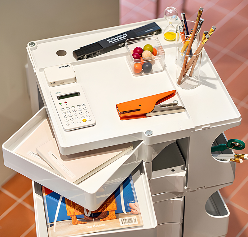 キャスター付きの本体を回転させることで側面4面すべてを効率的に使える、デザイン性と機能性に優れた収納家具です。