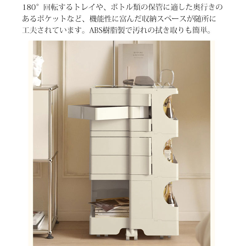 キャスター付きの本体を回転させることで側面4面すべてを効率的に使える、デザイン性と機能性に優れた収納家具です。