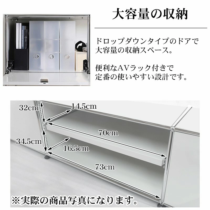 2つのドロップダウンドアにAV機器用のディバイダーシェルフが付いたテレビボードです。
