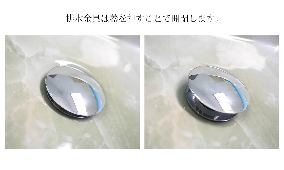 手洗い鉢と排水ホースセットでの販売で排水金具は蓋を押すことで開閉します。