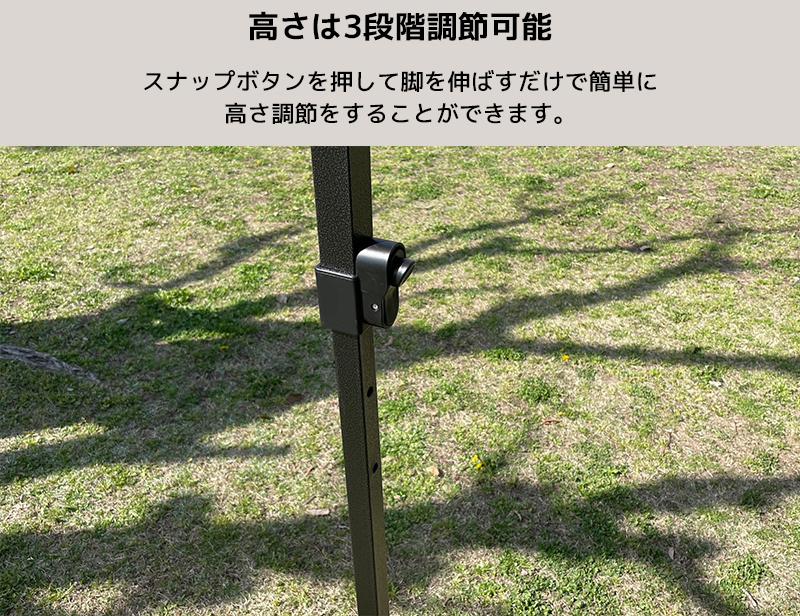 高さは3段階調節可能、スナップボタンを押して脚を伸ばすだけで簡単に高さを調節することが出来ます。
