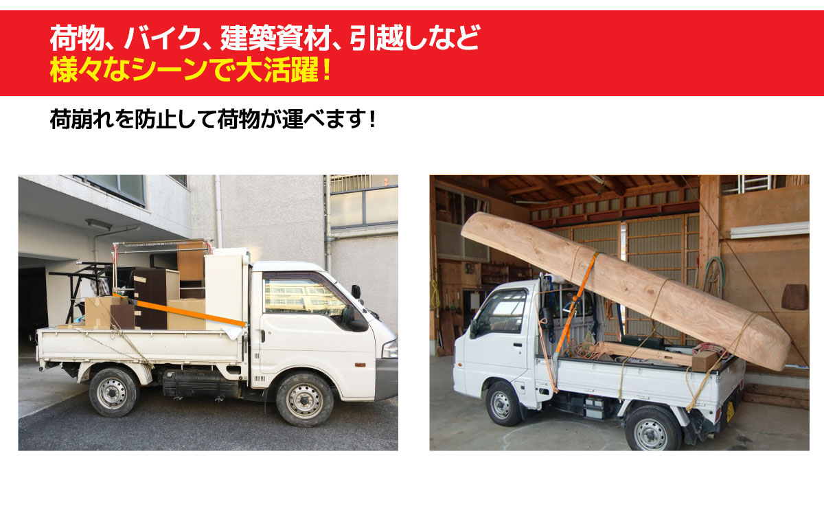 丸型、角型から様々な形の荷物に対応。荷締具の優等生です。