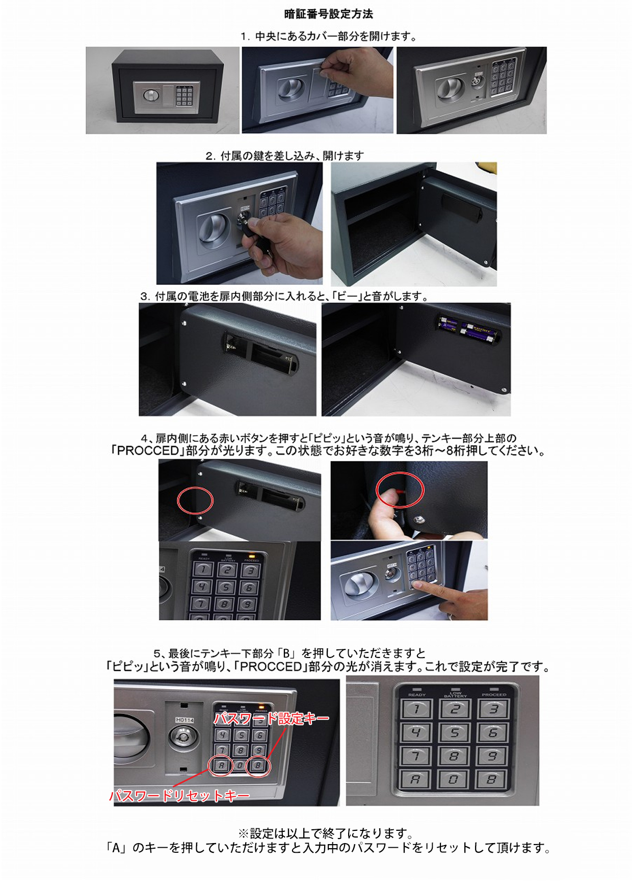 扉内側の赤いボタンを押して、3桁~8桁の暗証番号を登録。