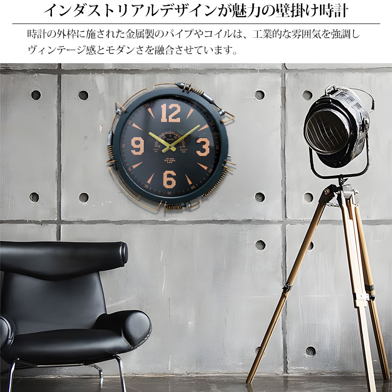 時計の外枠に施された金属製のパイプやコイルは工業的な雰囲気を強調し、