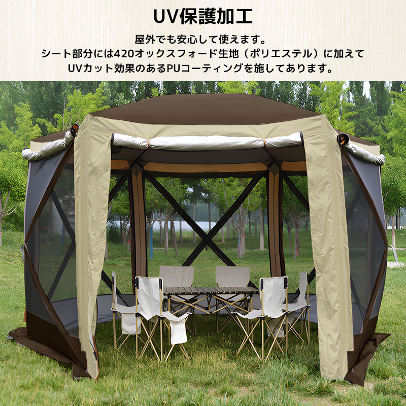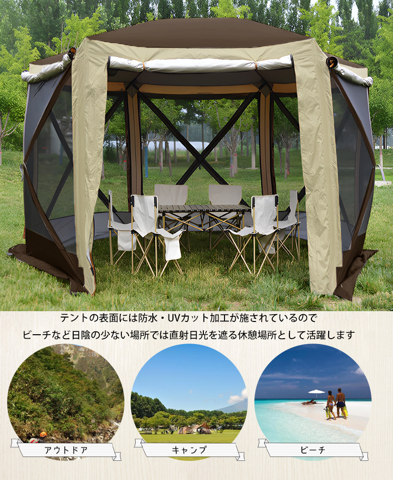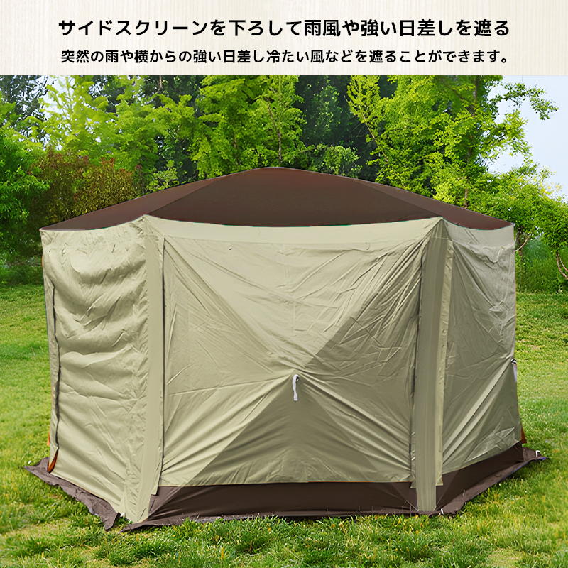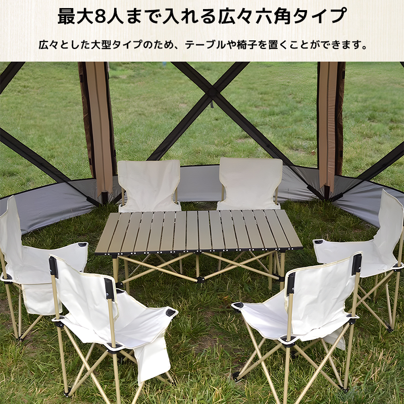 入り口のウインドパネルはタープとしても使えるので、日陰の下で食事をしたり、ゆったりくつろぐことができます