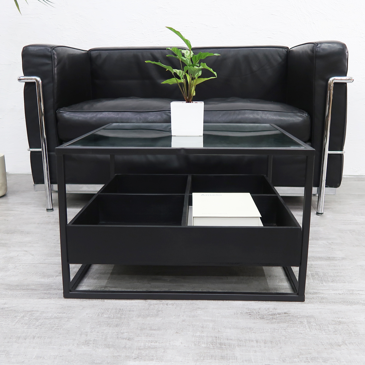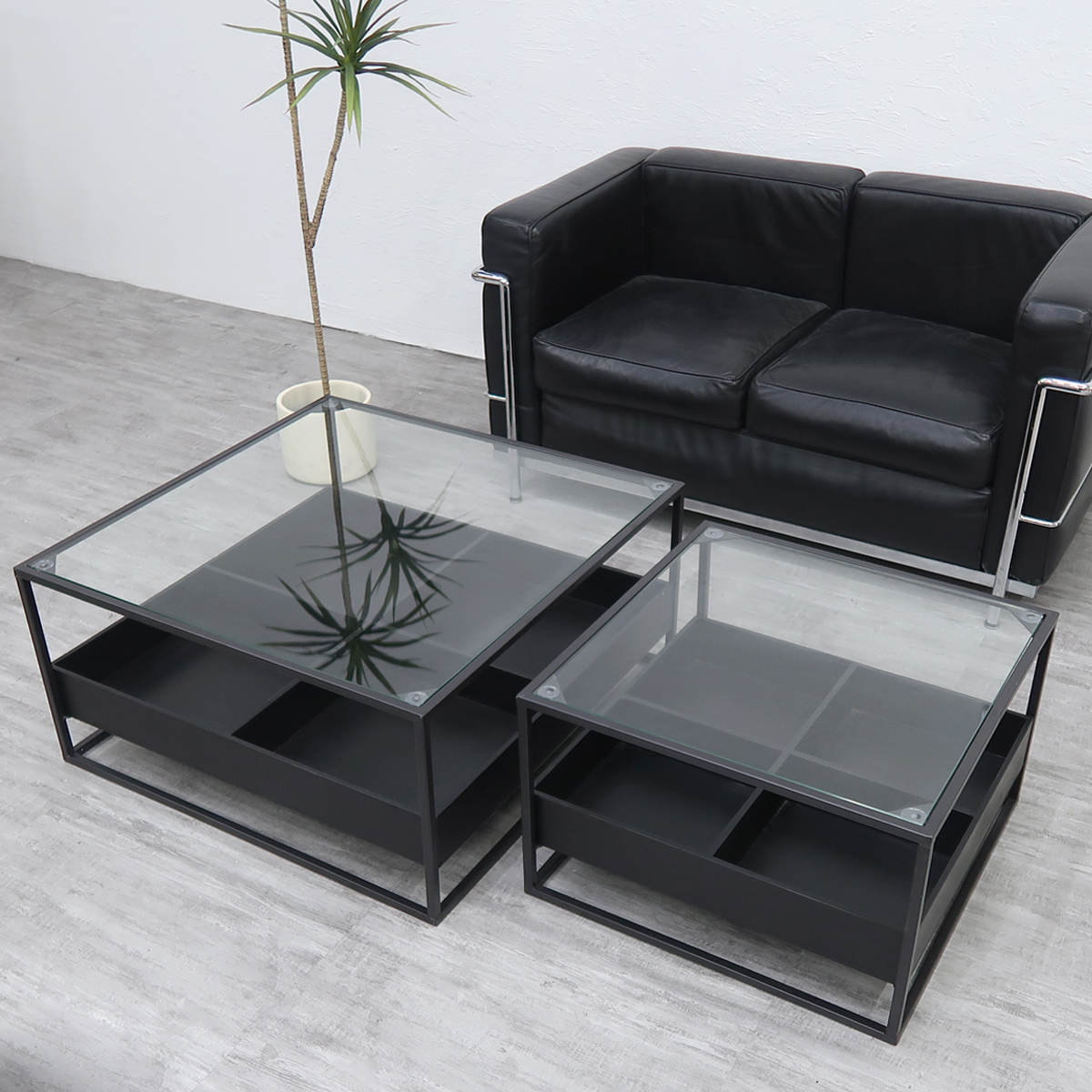 アルミフレームとガラス天板の異素材の組み合わせが独創性を放つセンターテーブル。