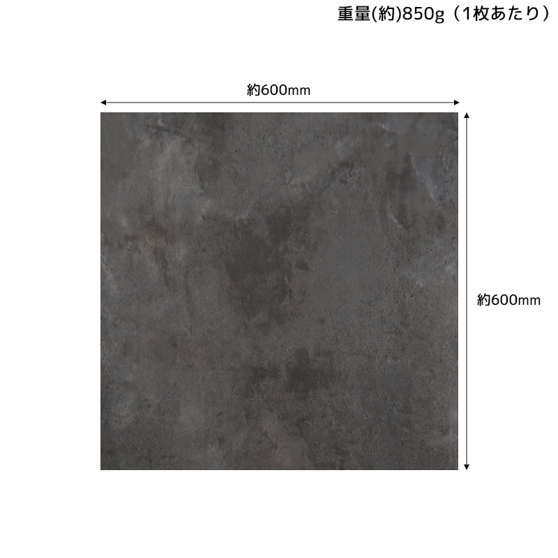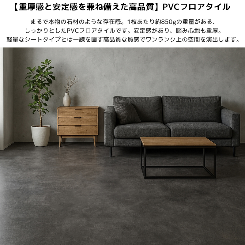 まるで本物の石材のような存在感。1枚あたり約850gの重量がある、しっかりとしたPVCフロアタイルです。安定感があり、踏み心地も重厚。軽量なシートタイプとは一線を画す高品質な質感で、ワンランク上の空間を演出します。