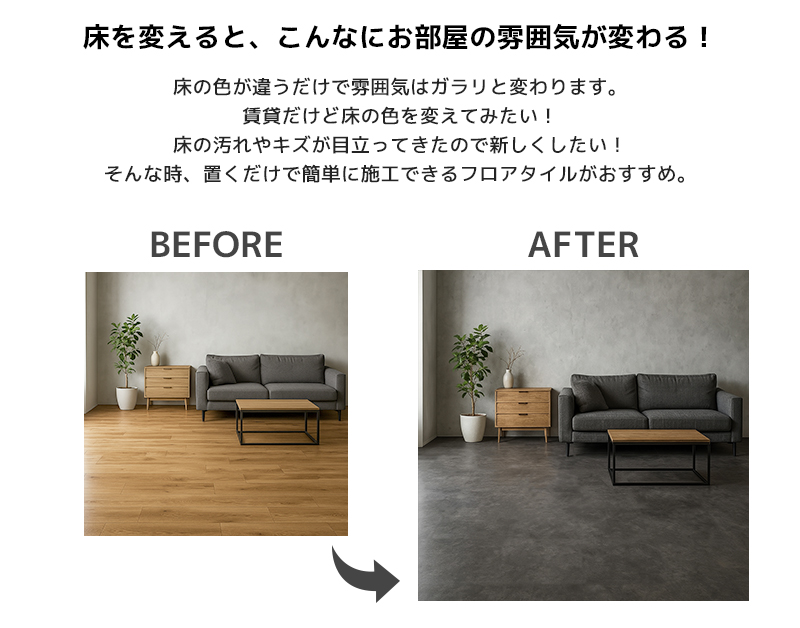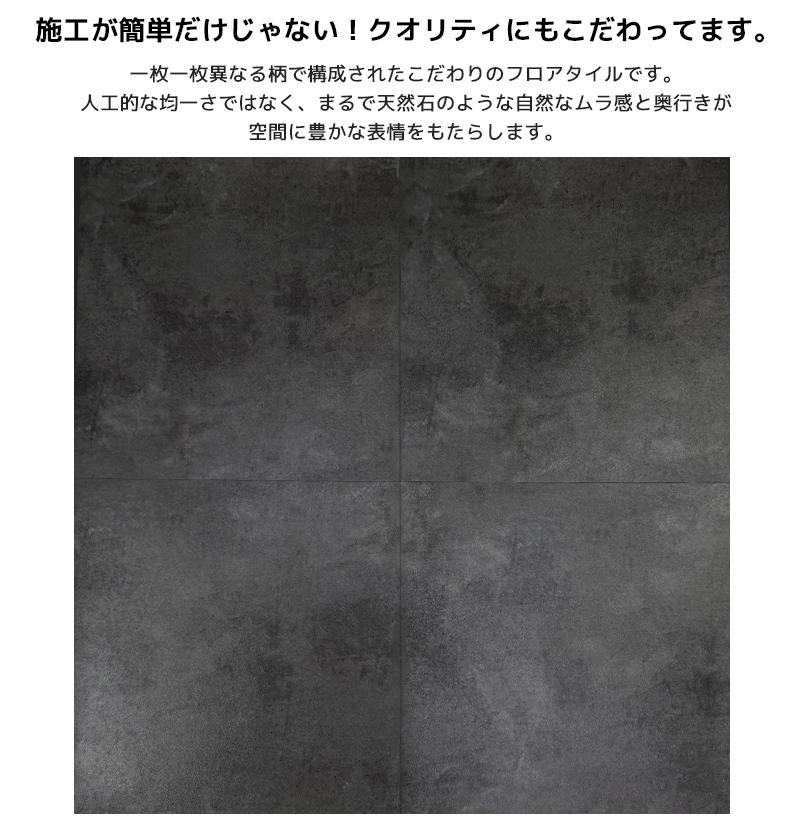 本製品は、一枚一枚異なる柄で構成されたこだわりのフロアタイルです。人工的な均一さではなく、まるで天然石のような自然なムラ感と奥行きが空間に豊かな表情をもたらします。同じタイルでも、並べ方次第で表情が変化し、あなただけの“魅せる床”に。