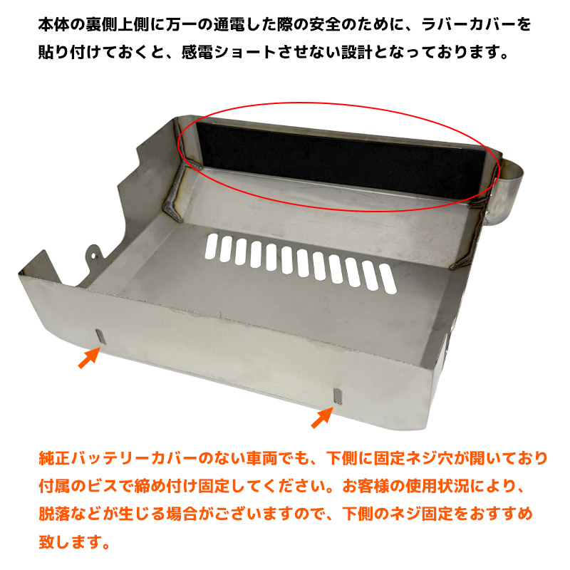 ※純正バッテリーカバーの無い車両に関しては、ビス止めなどの対応となっております。お客様の使用状況により、脱落などが生じる場合がございますので、ネジ止めなどの加工が必要となる場合がございますので、ご了承ください。