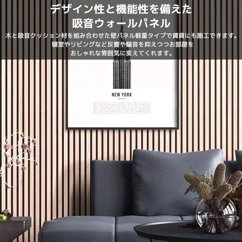 木と吸音クッション材を組み合わせた壁パネル軽量タイプで賃貸にも施工できます。