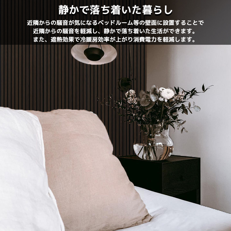 近隣からの騒音が気になるベッドルーム等の壁面に設置することで近隣からの騒音を軽減し、静かで落ち着いた生活ができます。