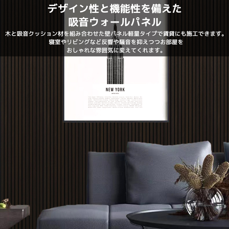 木と吸音クッション材を組み合わせた壁パネル軽量タイプで賃貸にも施工できます。