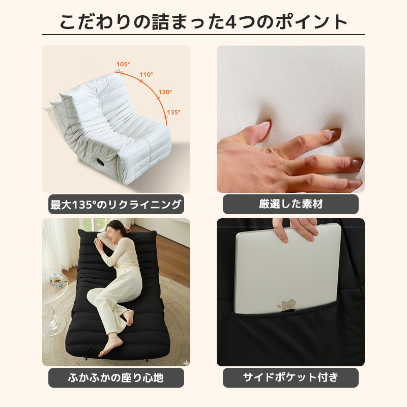 このソファは最大135°までリクライニング可能でお好みの角度でリラックスできる設計です。