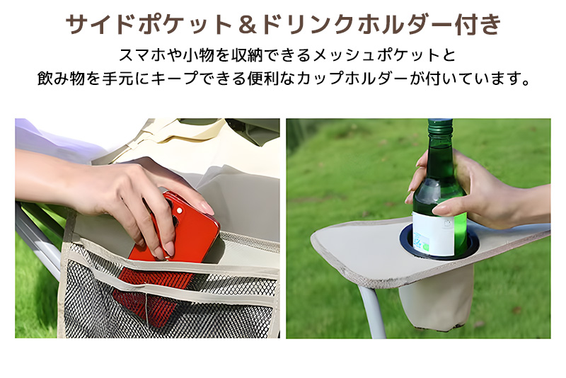 ■ドリンクホルダー付き:飲み物を手元にキープできる便利なカップホルダー。