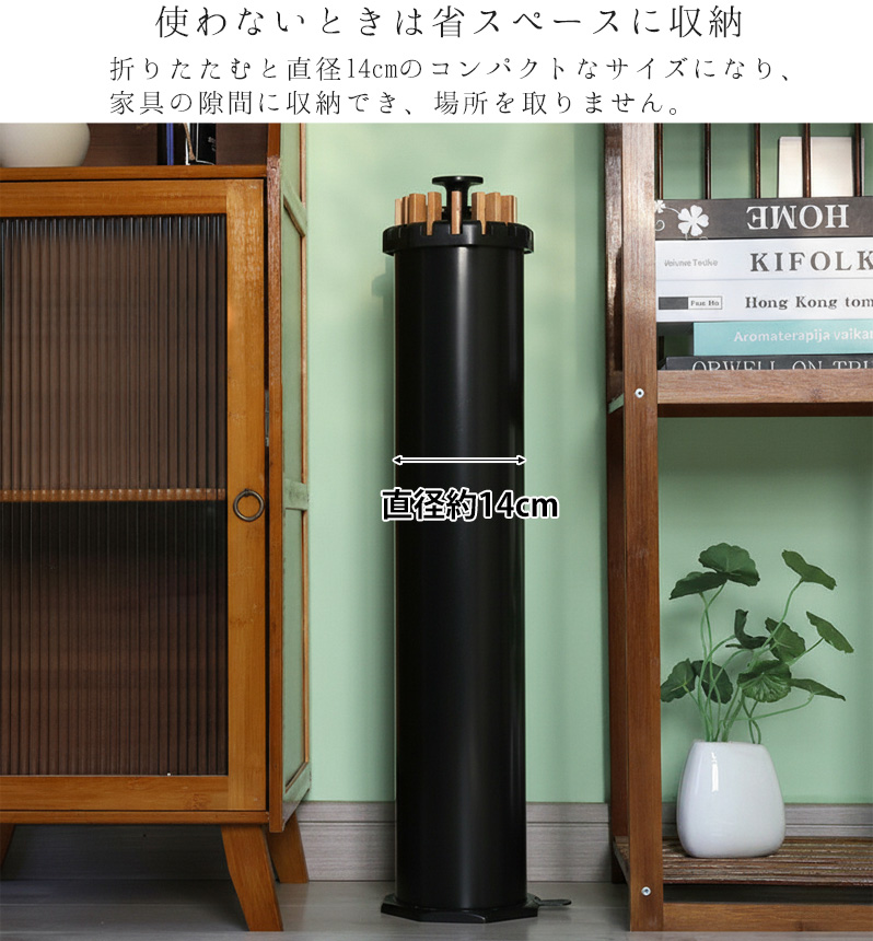 使わないときは省スペースに収納。折りたたむと直径14cmのコンパクトなサイズになり、家具の隙間に収納でき、場所を取りません。狭い部屋でもスッキリ片付けられ、収納時に邪魔にならず、必要な時にサッと取り出してすぐに使えます。収納時も場所を取らないので、賢くスペースを活用できます。