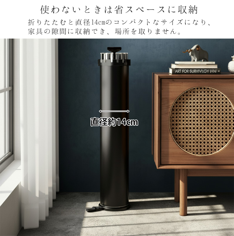 使わないときは省スペースに収納。折りたたむと直径14cmのコンパクトなサイズになり、家具の隙間に収納でき、場所を取りません。狭い部屋でもスッキリ片付けられ、収納時に邪魔にならず、必要な時にサッと取り出してすぐに使えます。収納時も場所を取らないので、賢くスペースを活用できます。