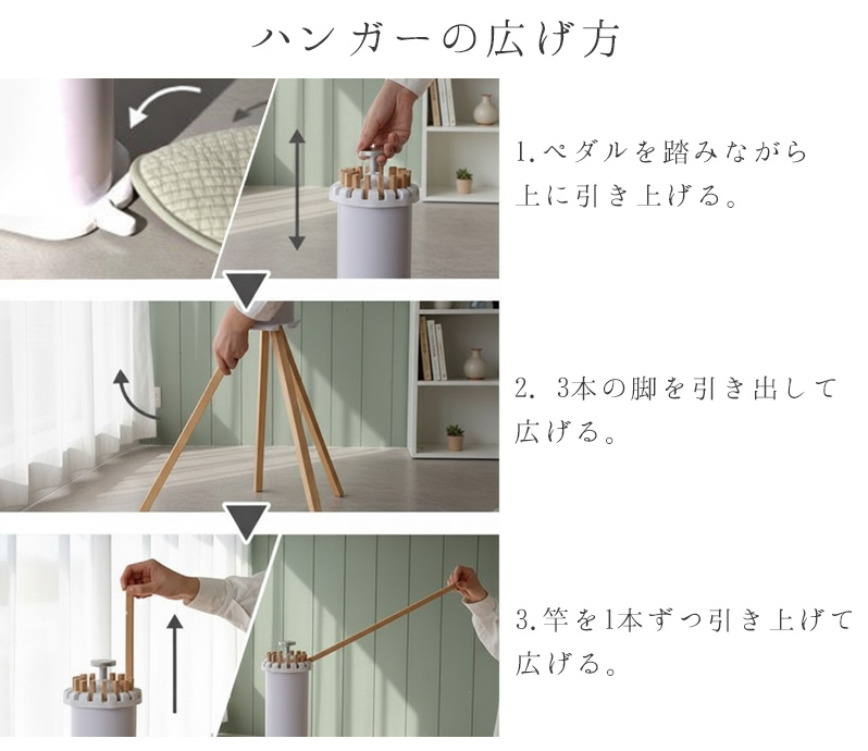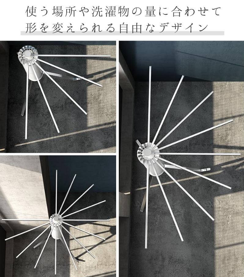 最大16本の物干し竿で大容量の洗濯物にも対応! 狭いスペースでも広いスペースでも、柔軟にサイズを調整でき、必要な分だけ竿を出して使えるので、無駄なく効率よくお洗濯ができます。 さらに、竿の数を減らしてコンパクトに使うことも可能で、家族の人数や場所に応じて使い方を変えることができます。