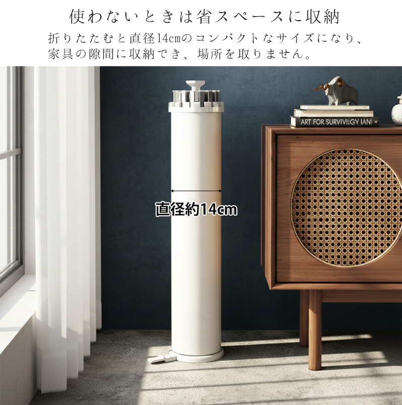 使わないときは省スペースに収納。折りたたむと直径14cmのコンパクトなサイズになり、家具の隙間に収納でき、場所を取りません。狭い部屋でもスッキリ片付けられ、収納時に邪魔にならず、必要な時にサッと取り出してすぐに使えます。収納時も場所を取らないので、賢くスペースを活用できます。