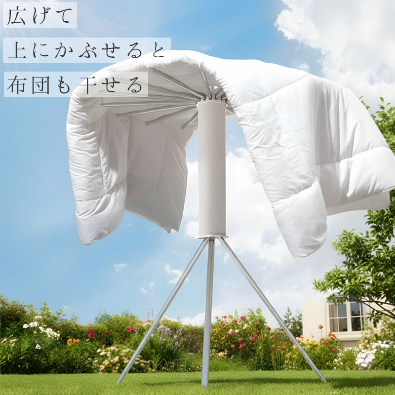 広げて上にかぶせると布団も干せるので、忙しい日常でも簡単に大きなアイテムを干すことができます。布団やシーツをしっかりと乾かせる広いスペースを確保でき、風通しが良いため、効率よく乾燥させることができます。