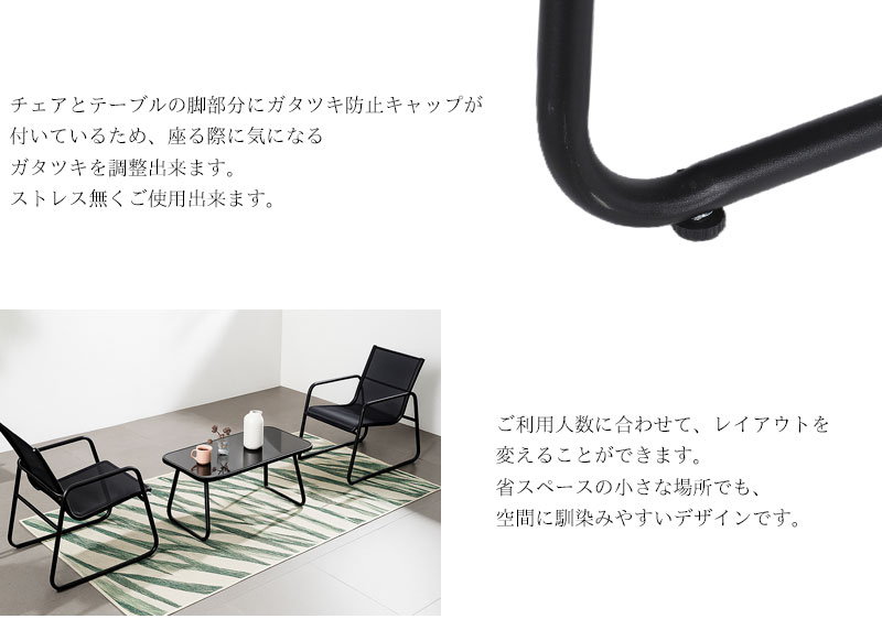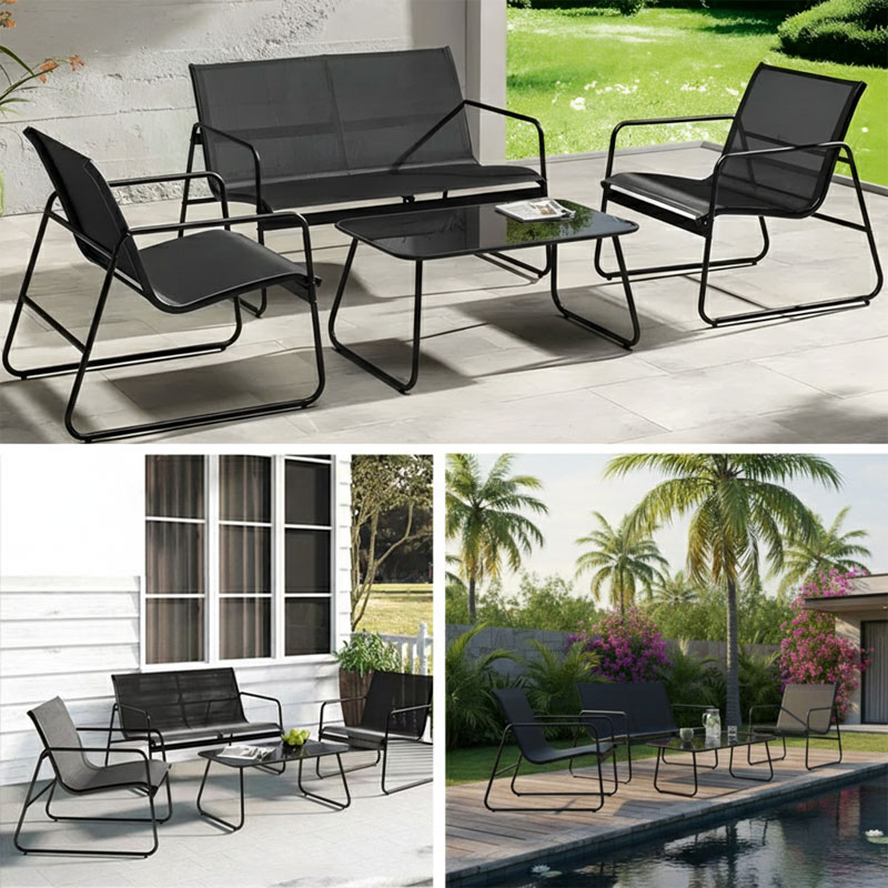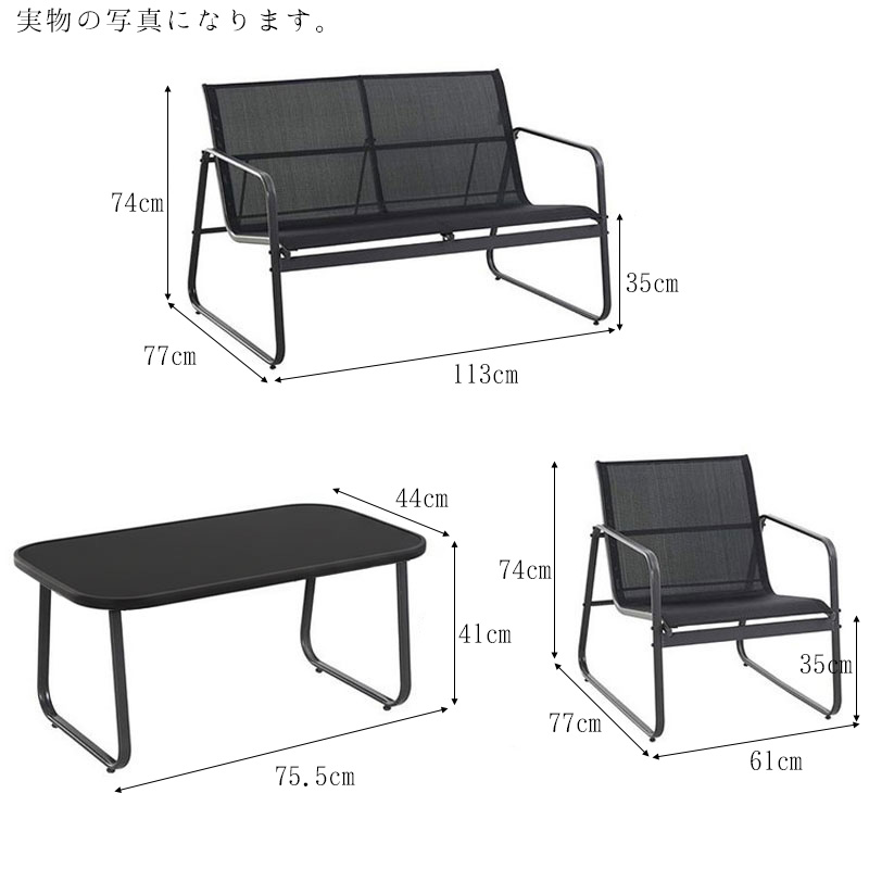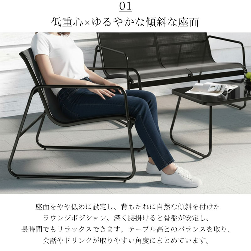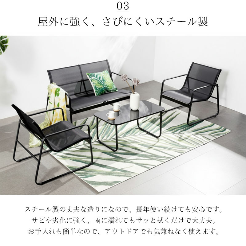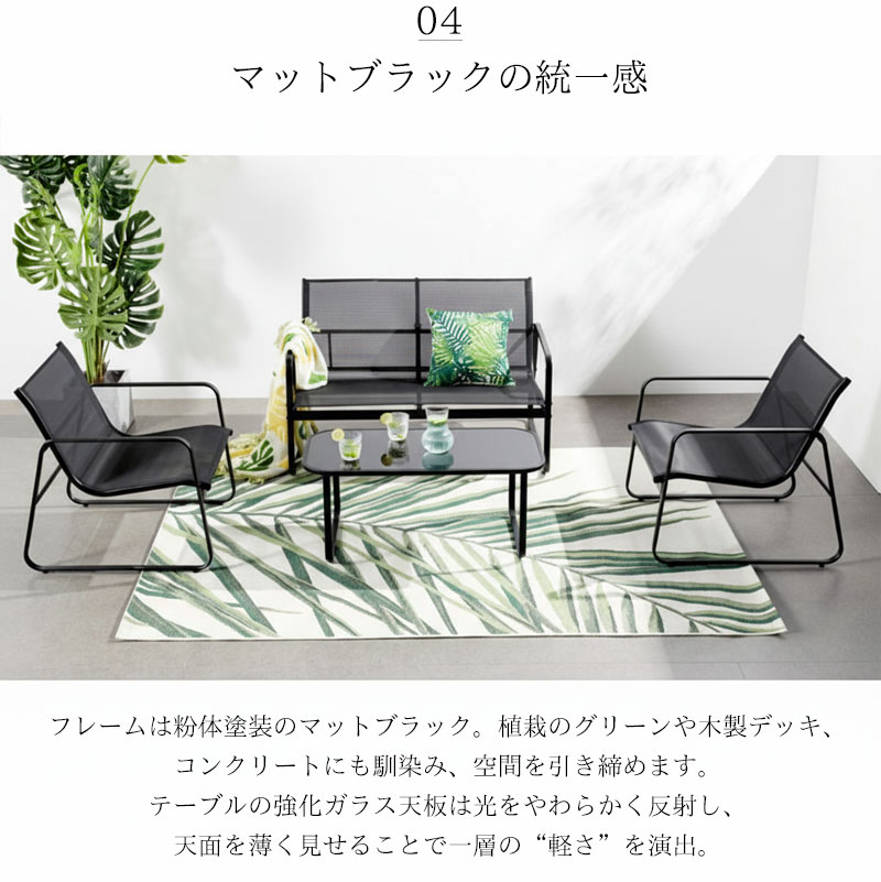 チェアとソファは通気性に優れたメッシュ素材を使用し、暑い季節でも快適。ブラックカラーのスチールフレームは耐久性・防サビ性に優れ、屋外でも安心してお使いいただけます。