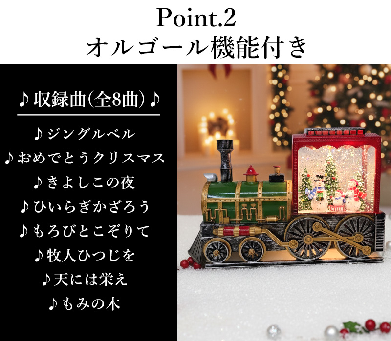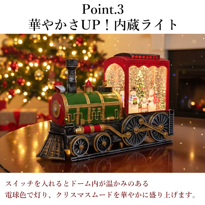 車両の後部には、サンタクロースやスノーマンたちがツリーを囲む賑やかなシーンが広がり、スイッチを入れるとふんわりと雪が舞い、温かい光が幻想的に灯ります。