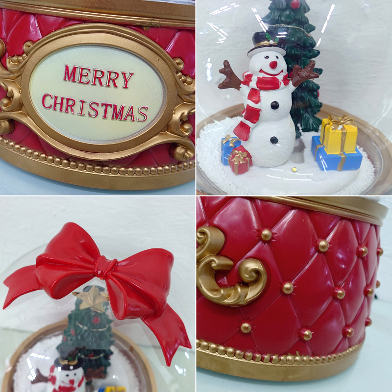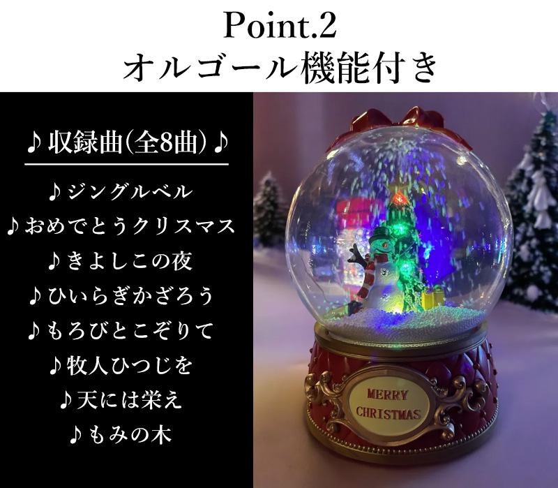台座には「MERRY CHRISTMAS」のエンブレムがあしらわれ、赤とゴールドの装飾が上品で華やか。