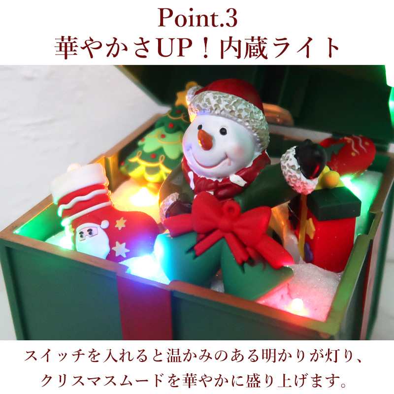 中からはかわいい雪だるまが顔を出したり隠れたりして、まるでサプライズプレゼントのような楽しい演出をしてくれます。