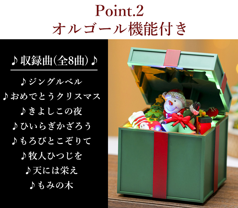 電源を入れると、楽しいクリスマスソングが流れ、プレゼントボックスが自動で開閉!