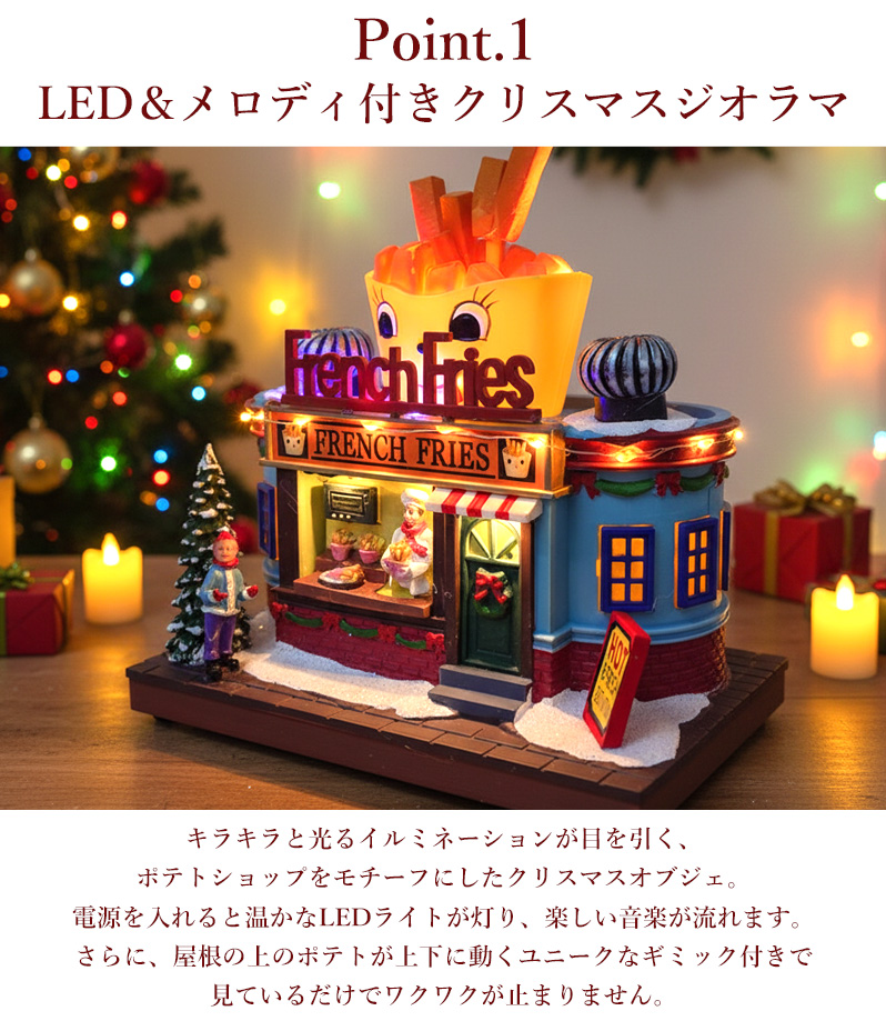 キラキラと光るイルミネーションが目を引く、ポテトショップをモチーフにしたクリスマスジオラマ。