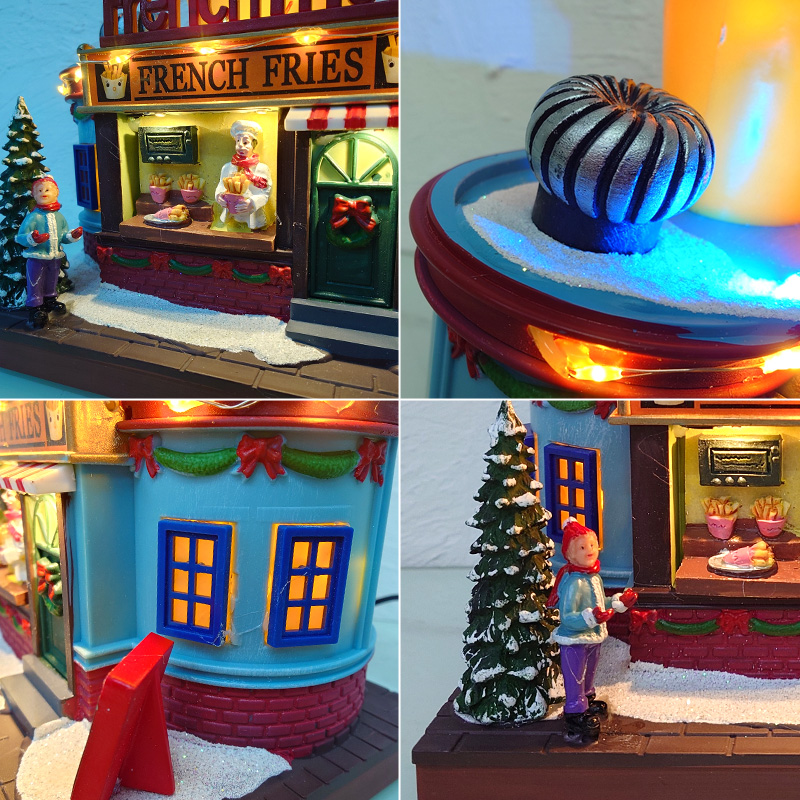 細部まで丁寧に作り込まれた造形が魅力で、窓辺のシェフや店先の看板、レンガ調の壁や雪化粧の歩道まで、どこを見ても温もりを感じる仕上がりです。