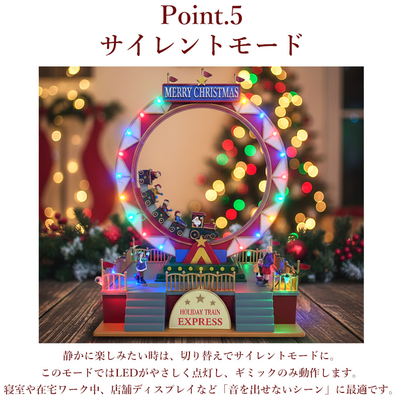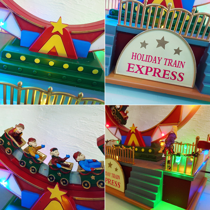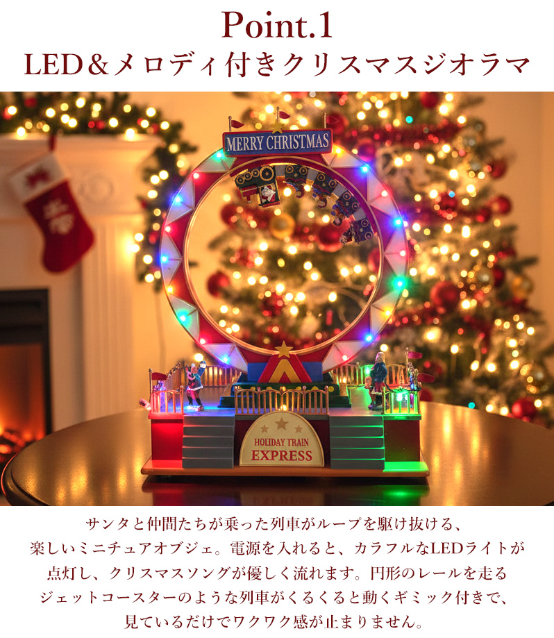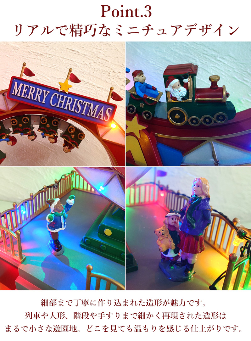 円形のレールを走るジェットコースターのような列車がくるくると動くギミック付きで、見ているだけでワクワク感が止まりません。