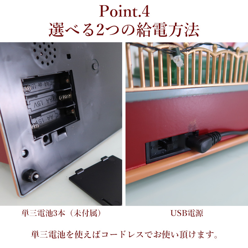 電源を入れると、カラフルなLEDライトが点灯し、クリスマスソングが優しく流れます。