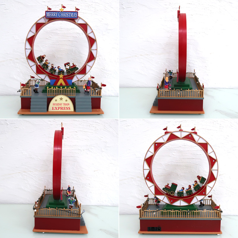 サンタと仲間たちが乗った列車がループを駆け抜ける、楽しいミニチュアオブジェ。