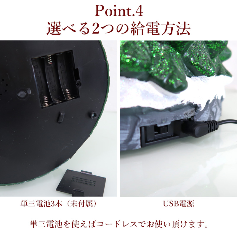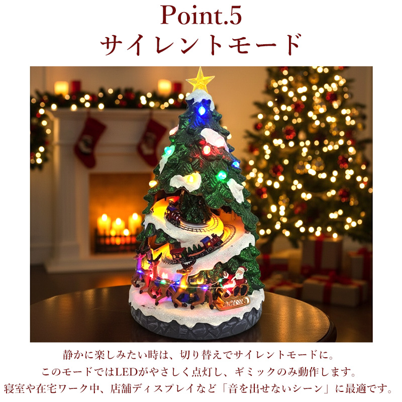 電源を入れると、ツリー全体にカラフルなLEDライトが点灯し、心温まるクリスマスソングが流れます。