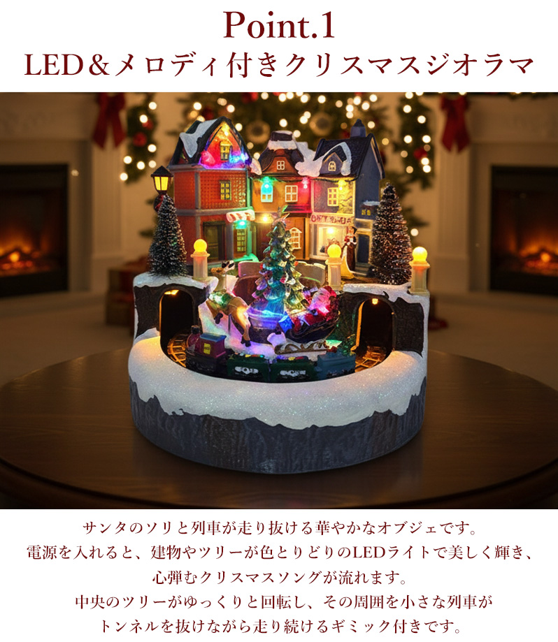 幻想的なクリスマスタウンを舞台に、サンタのソリと列車が走り抜ける華やかなオブジェです。