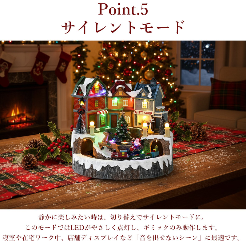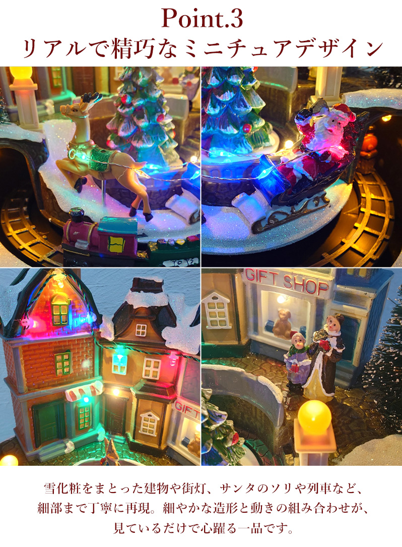 電源を入れると、建物やツリーが色とりどりのLEDライトで美しく輝き、心弾むクリスマスソングが流れます。