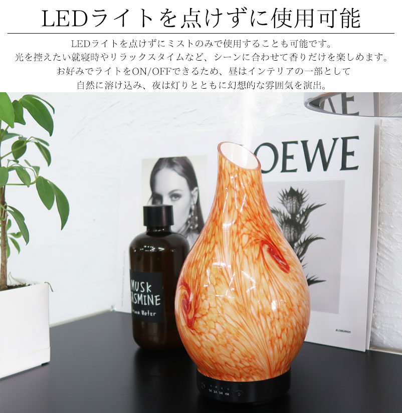 アロマディフューザーとしてはもちろん、ふんわりとした灯りでお部屋の雰囲気づくりにも活躍します。