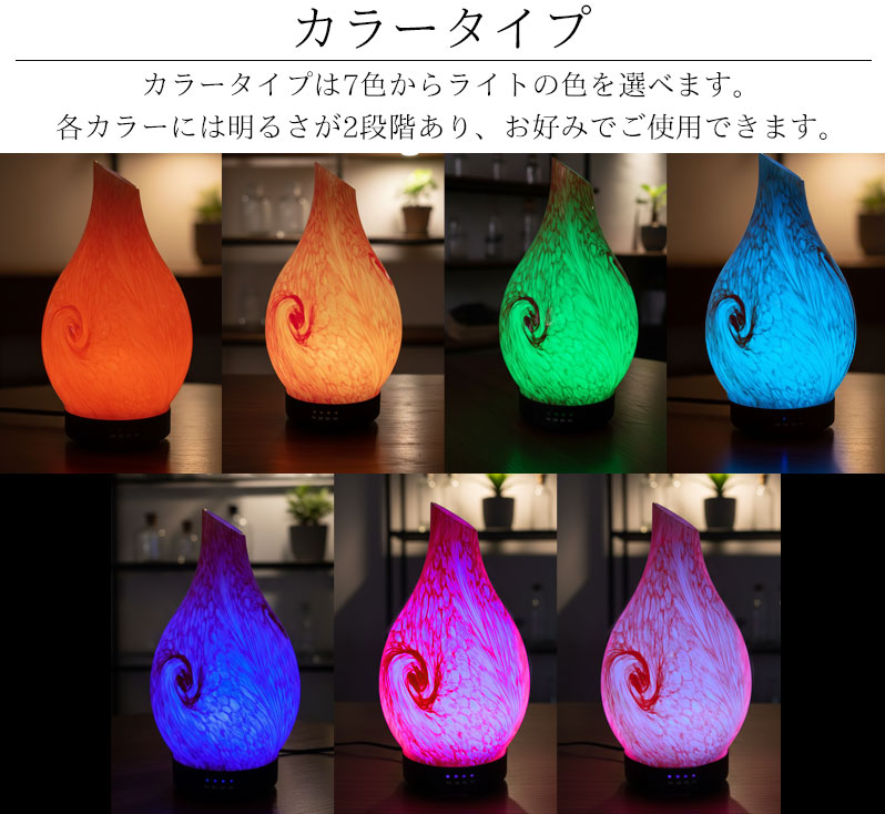 点灯時は幻想的な7色の光がガラスの内部で優しく揺らめき、消灯時でも高級感あふれるインテリアオブジェとして存在感を発揮。