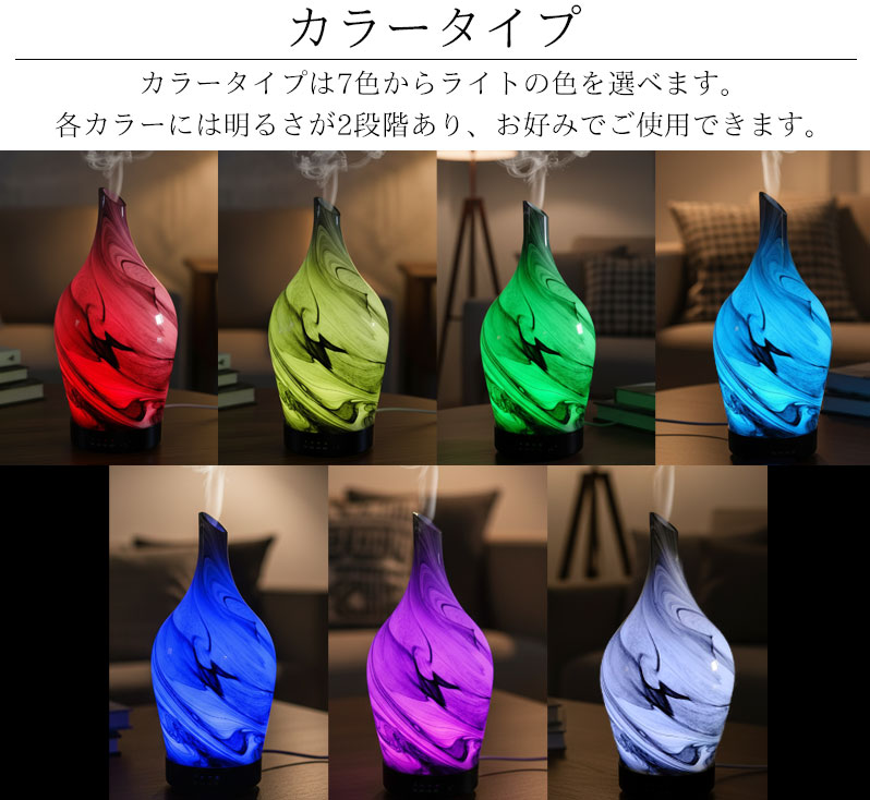 点灯時は幻想的な7色の光がガラスの内部で優しく揺らめき、消灯時でも高級感あふれるインテリアオブジェとして存在感を発揮。