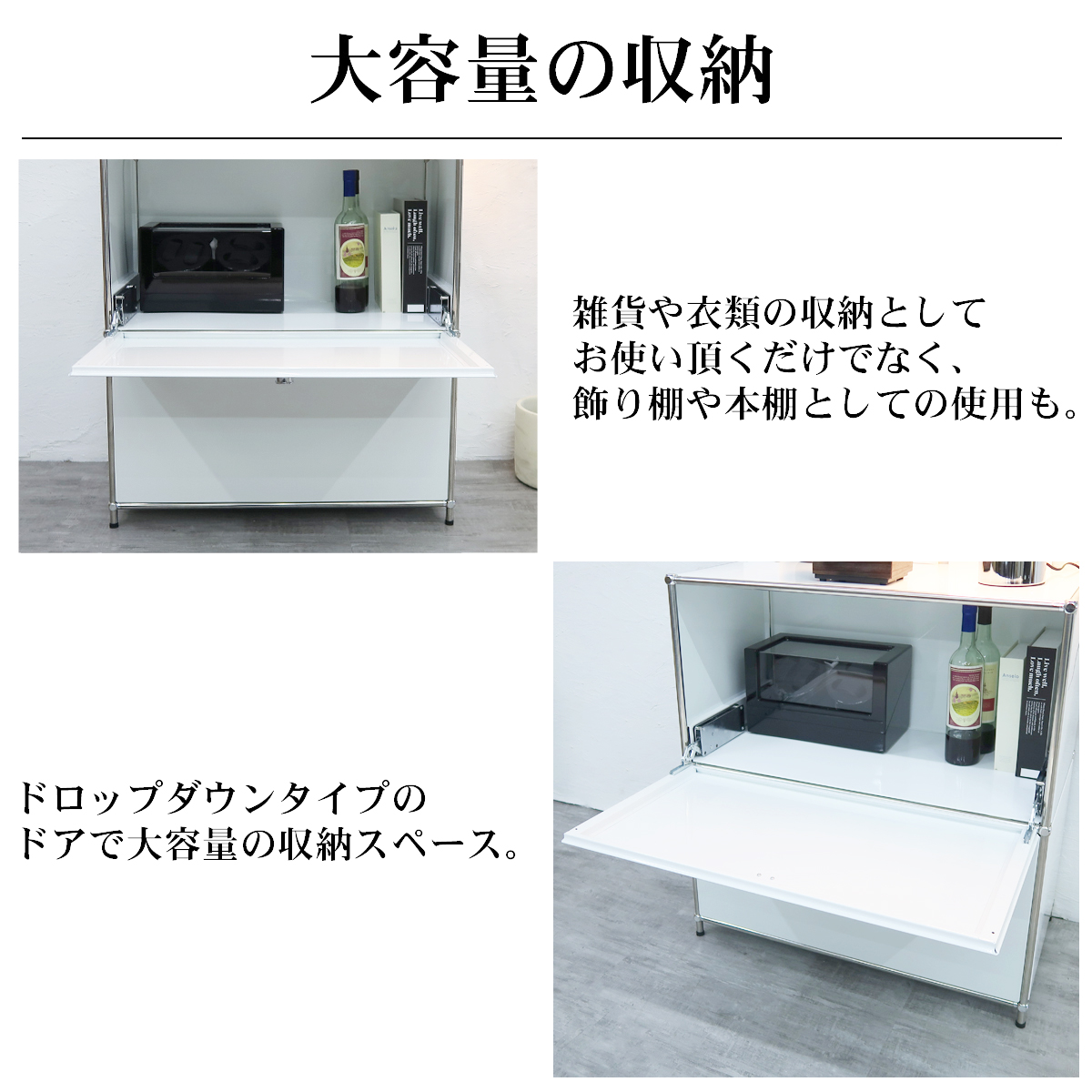 ドロップダウンドアが付いた2段のサイドボード。
