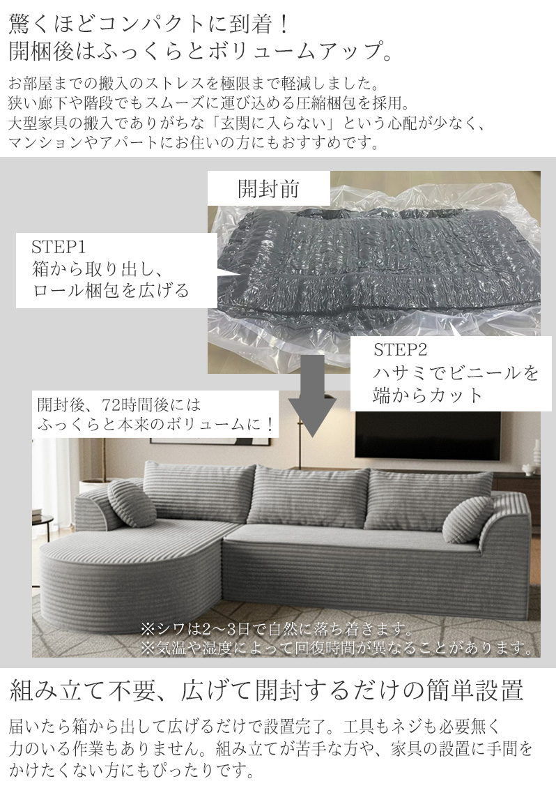4.圧縮ソファの特性上、開封時には布カバーに目立つ折れシワがあります。