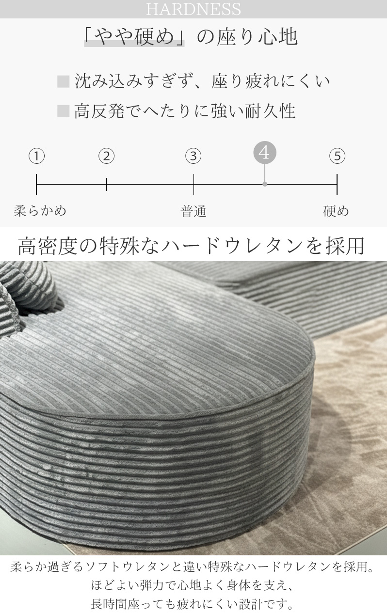 太い畝(うね)が魅力的な表情を魅せるコーデュロイ素材を採用。表面はやさしい起毛感がありつつ、夏も冬も快適に過ごせる触り心地。落ち着いた色味と豊かな質感で、どんなお部屋にも自然と溶け込み、上質な空間を演出します。