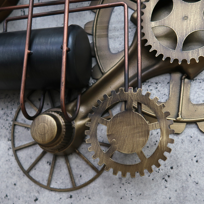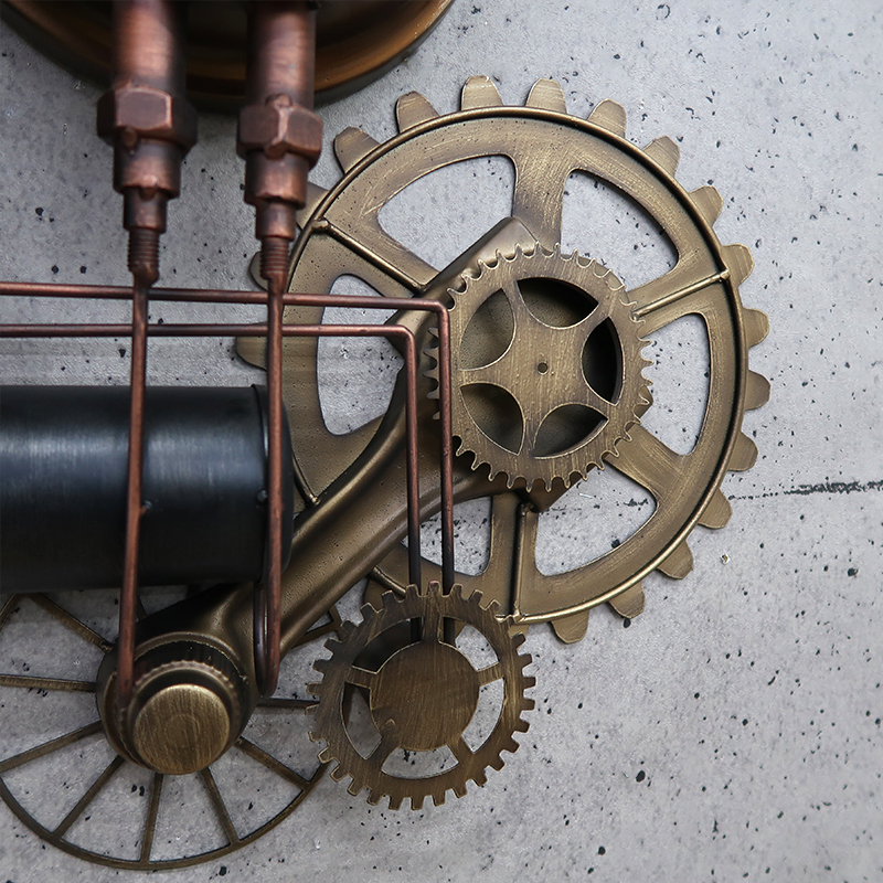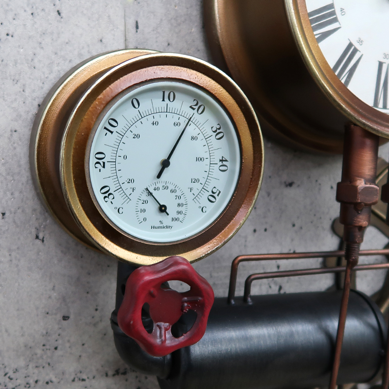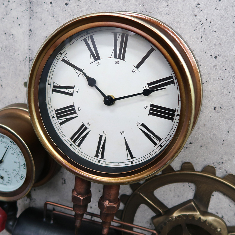 ボイラー室のスチーム管やスチームメーターなどスチームパンクなモチーフのウォールクロック。