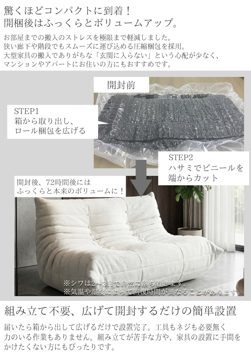 コンパクトに圧縮された状態で届きつつも、復元後はしっかりとした厚みと弾力があり一般的なソファと変わらない快適な座り心地を実現。