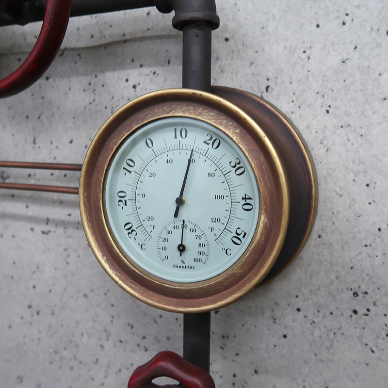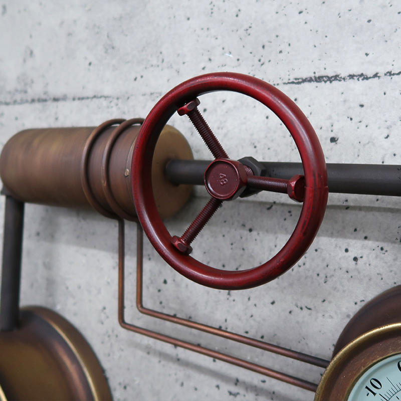 ボイラー室のスチーム管やスチームメーターなどスチームパンクなモチーフのウォールクロック。
