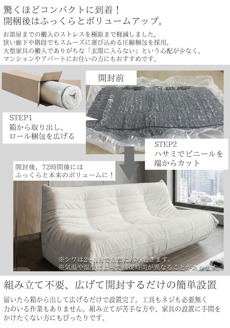 コンパクトに圧縮された状態で届きつつも、復元後はしっかりとした厚みと弾力があり一般的なソファと変わらない快適な座り心地を実現。