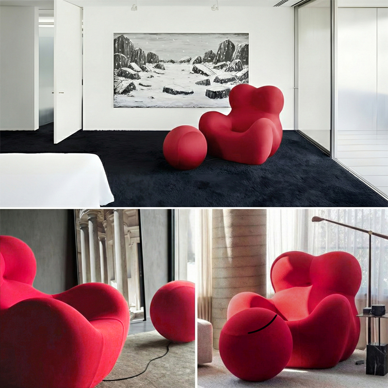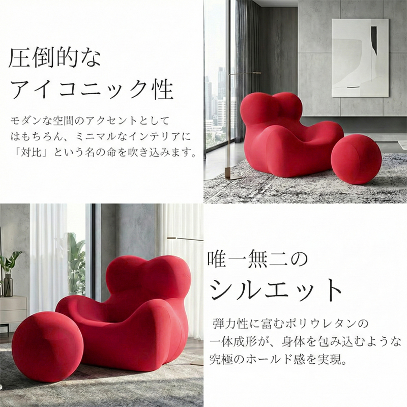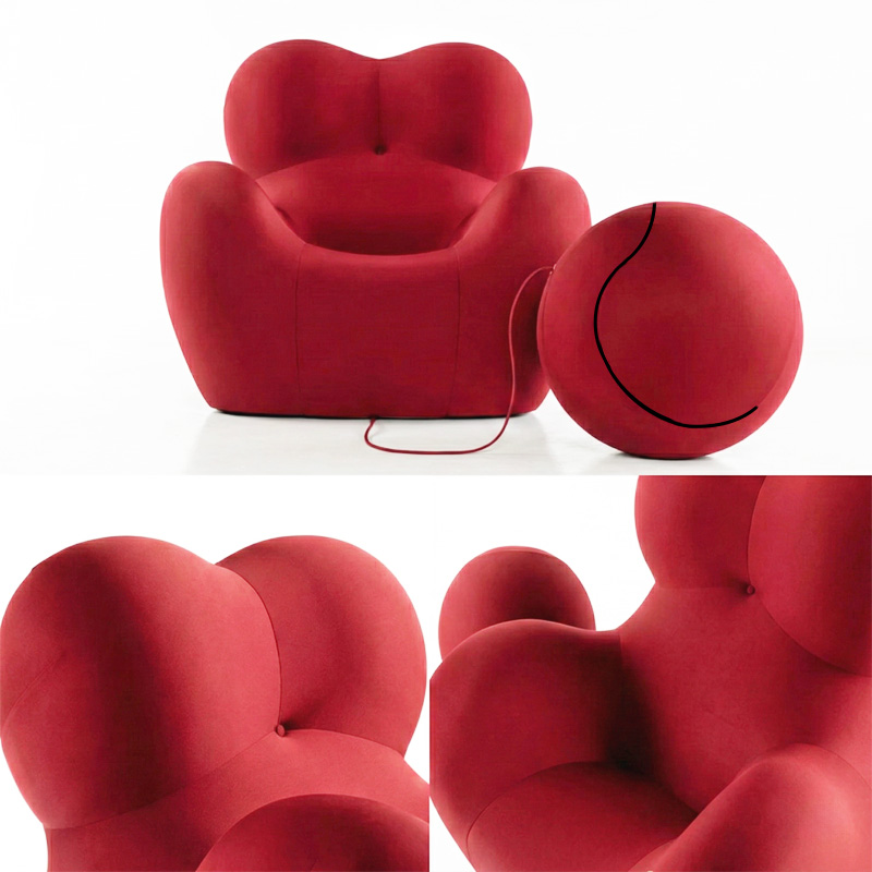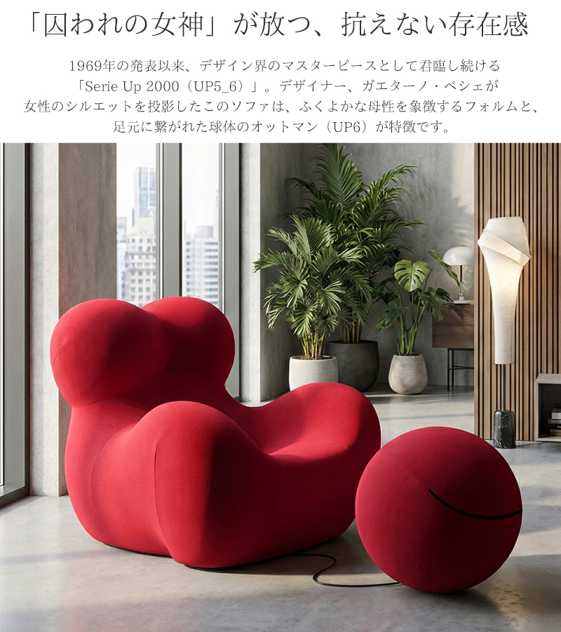 ふくよかな母性を象徴するフォルムと、足元に繋がれた球体のオットマン(UP6)が特徴です。
