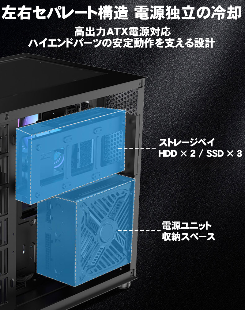 独立したエアフローにより、メインコンポーネントの冷却効率を飛躍的に向上させます。