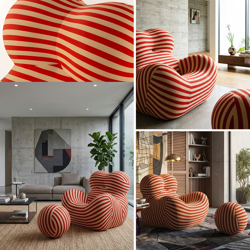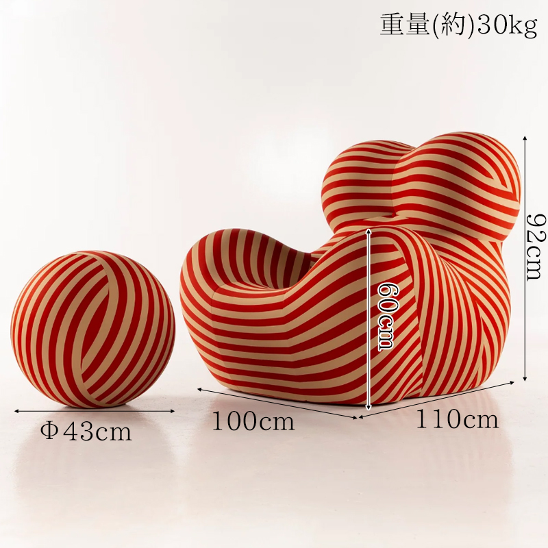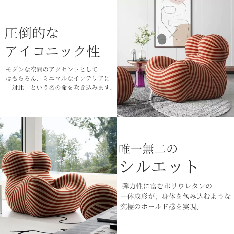 ふくよかな母性を象徴するフォルムと、足元に繋がれた球体のオットマン(UP6)が特徴です。